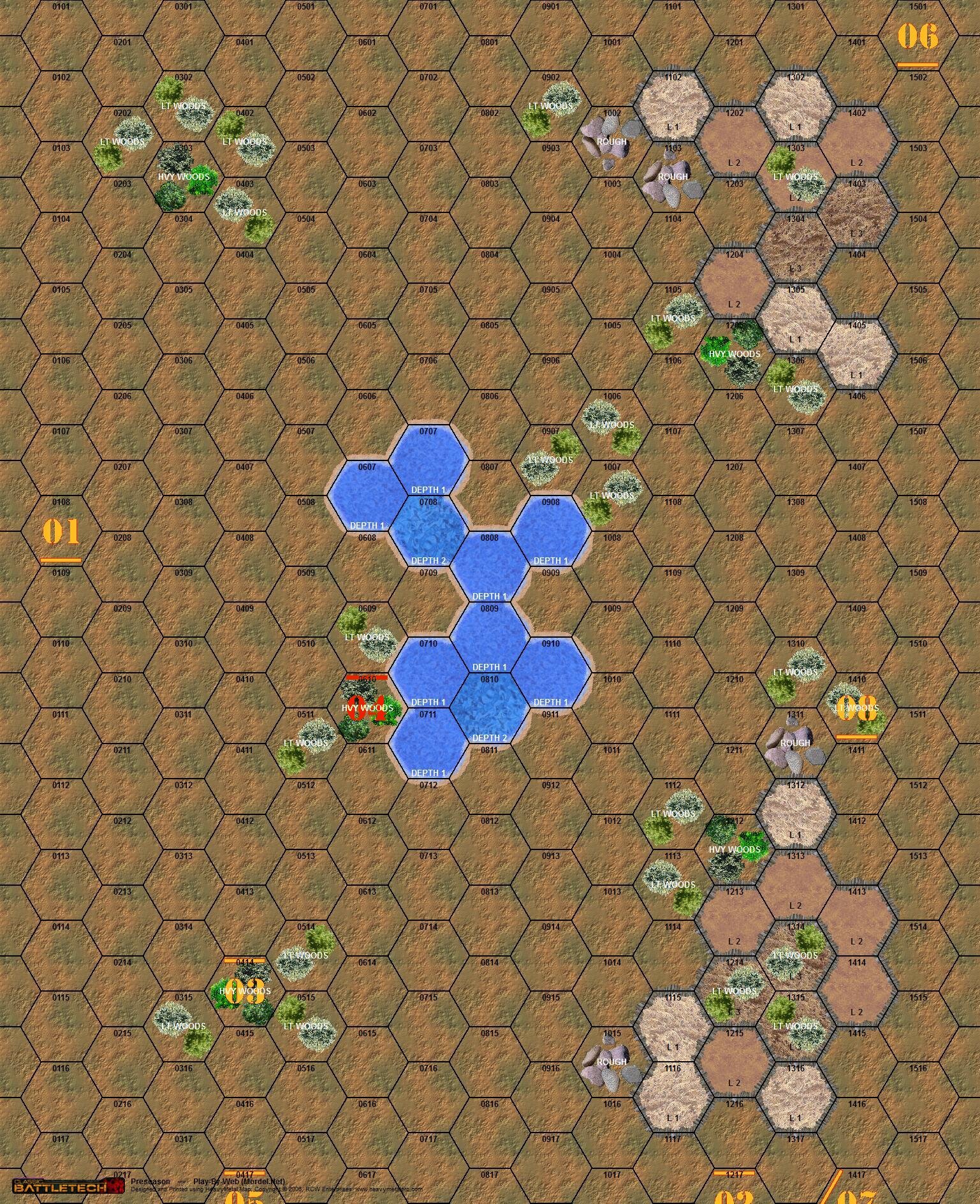 | Turn 7 Movement | | | 3. | PaWeasley | 0414F1 | Jump 4 Hexes | 0117F6 | | 4. | Stinger07 | 0610F1 (Prone) | Walk 0 Hexes | 0610F2 (Prone) | | 6. | Daishi100 | 1501F4 | Walk 4 Hexes | 1404F5 | | 2. | jymset | 1217F4 | Jump 5 Hexes | 1514F6 | | 1. | Vagabond | 0108F4 | Run 4 Hexes | 0510F3 | | 8. | Chunga | 1410F4 | Jump 6 Hexes | 1205F4 | | 5. | chihawk | 0417F1 | Jump 6 Hexes | 1017F1 | | 7. | Pinhead | 1417F6 | Jump 5 Hexes | 1213F1 |