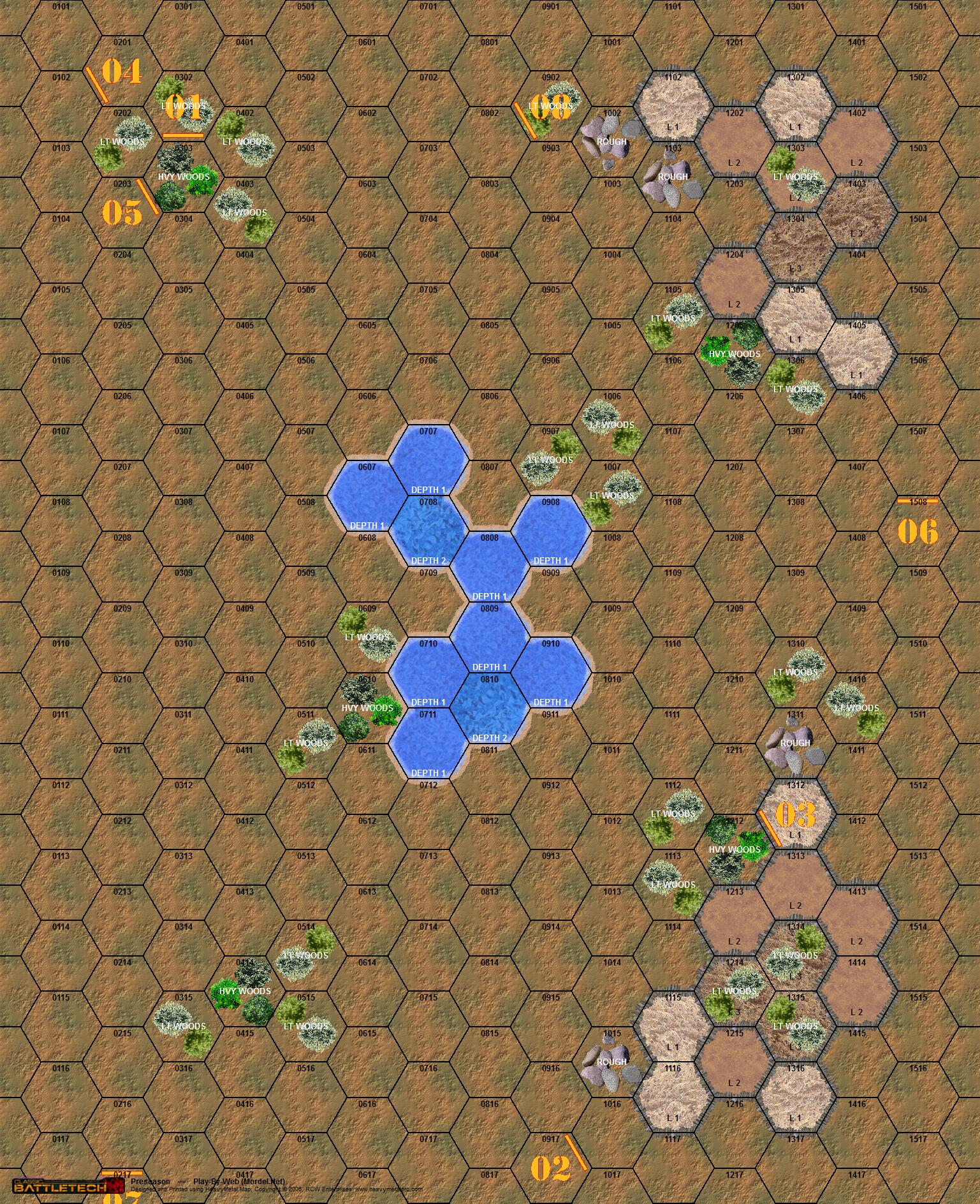 | Turn 7 Movement | | | 3. | PaWeasley | 0414F1 | Jump 4 Hexes | 0117F6 | | 4. | Stinger07 | 0610F1 (Prone) | Walk 0 Hexes | 0610F2 (Prone) | | 6. | Daishi100 | 1501F4 | Walk 4 Hexes | 1404F5 | | 2. | jymset | 1217F4 | Jump 5 Hexes | 1514F6 | | 1. | Vagabond | 0108F4 | Run 4 Hexes | 0510F3 | | 8. | Chunga | 1410F4 | Jump 6 Hexes | 1205F4 | | 5. | chihawk | 0417F1 | Jump 6 Hexes | 1017F1 | | 7. | Pinhead | 1417F6 | Jump 5 Hexes | 1213F1 |